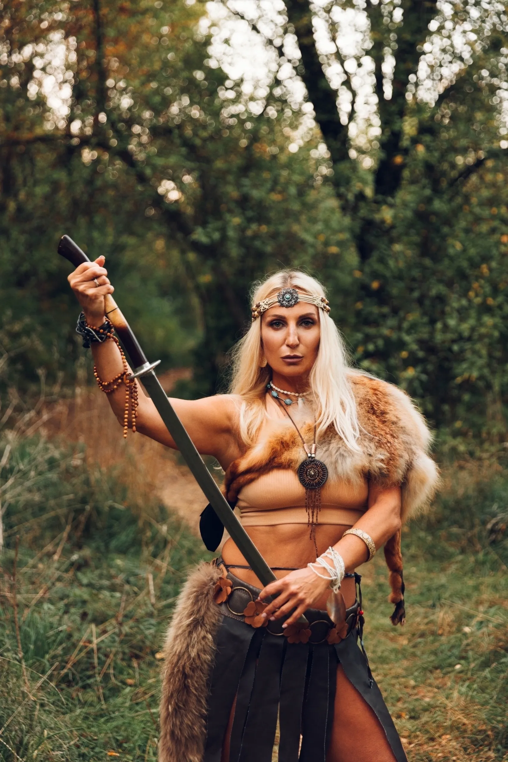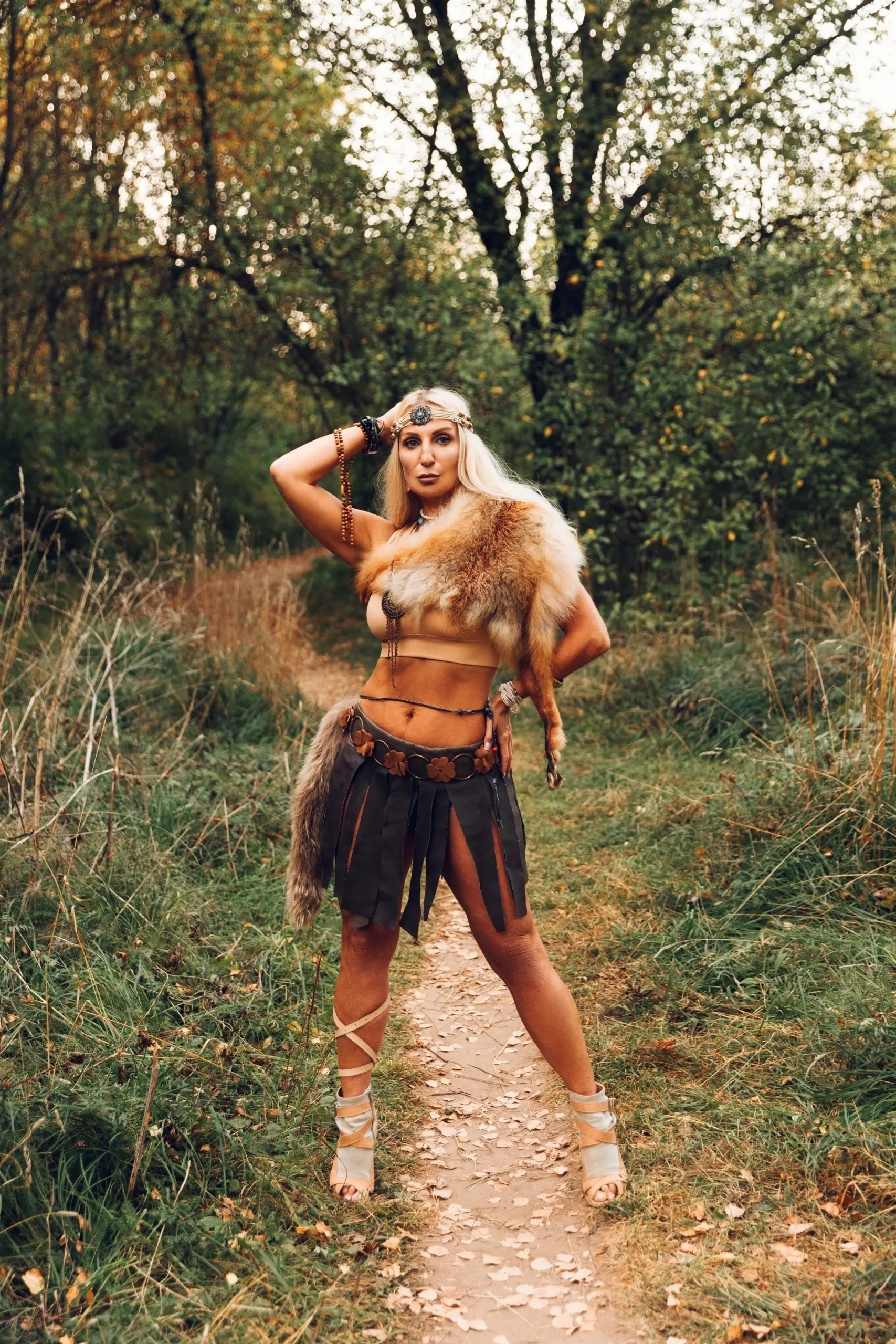 Кожаная юбка, пояс, шкуры и украшения.