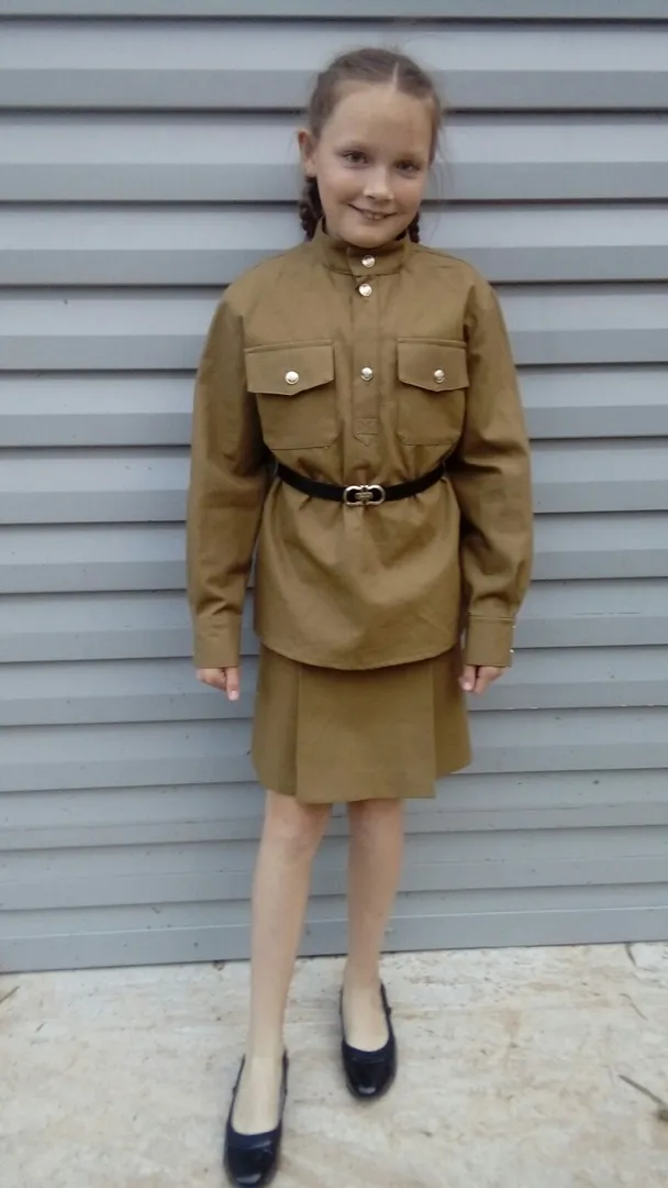 В комплект входит гимнастерка, юбка, ремень, пилотка.