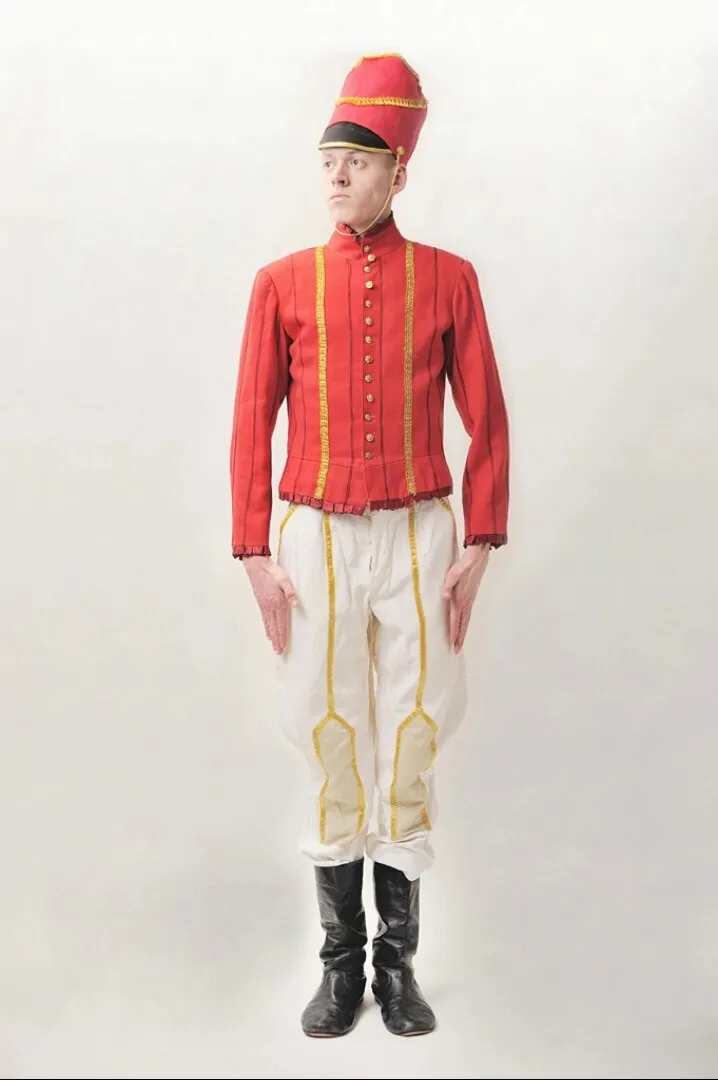 Комплект состоит из куртки с золотой отделкой и головного убора,