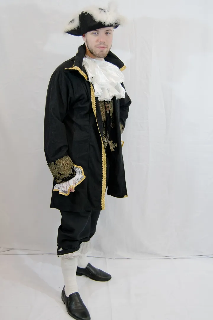В комплект входит комзол черный бархатный, жабо, , панталоны, брюки укороченные ,гольфы и треуголка.