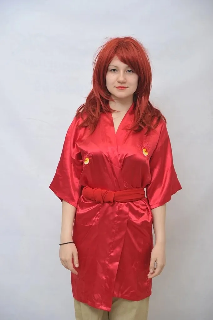 Описание: Красное кимоно с цветочным принтом в сочетании с белым поясом