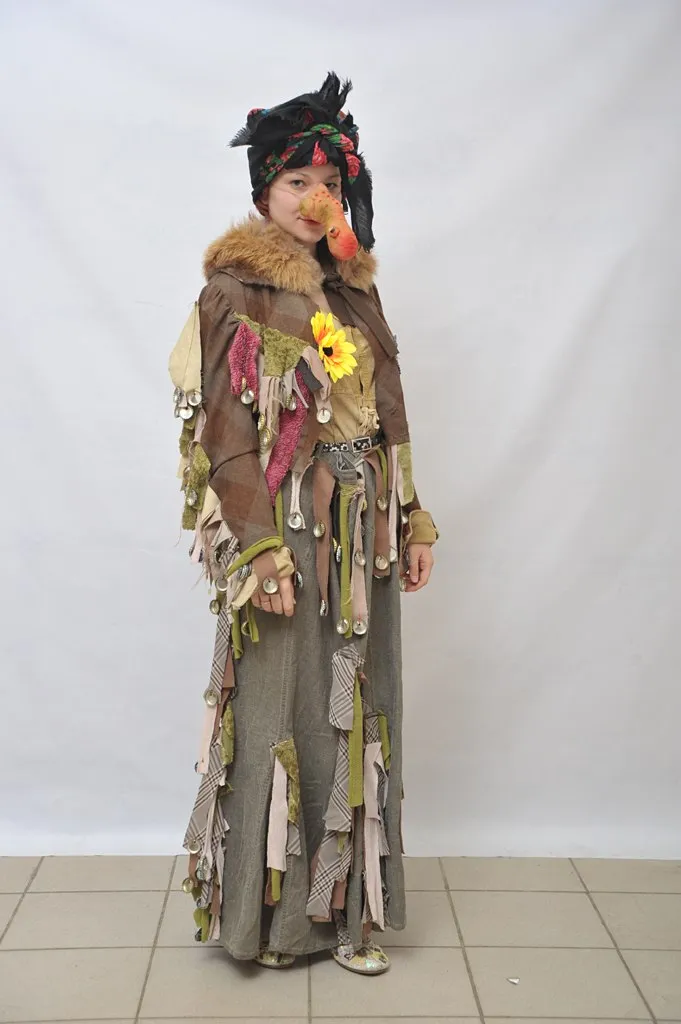 Описание: Комплект состоит из тонкой кофты, пиджака и юбки декорированных лоскутами ткани и крышками. Образ завершает бутафорский нос (в наличии и другие ) платок, повязанный на голове