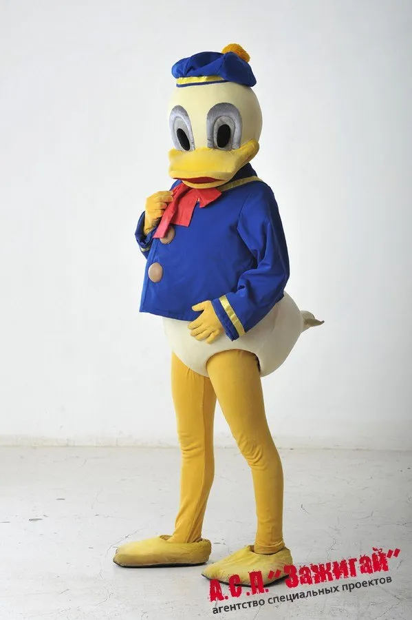Описание: Ростовой костюм Дональд Дакка состоит из поролонового туловища, лап, головы, съемного жакета, лосин и берета