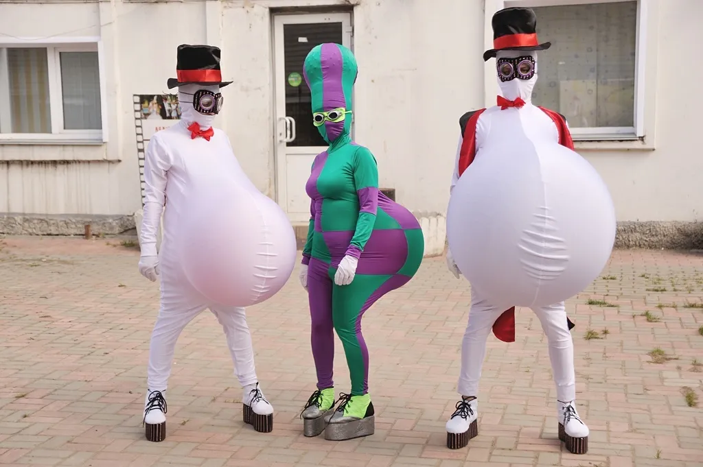 В комплект входит комбинезон, надувные шары, обувь, перчатки.