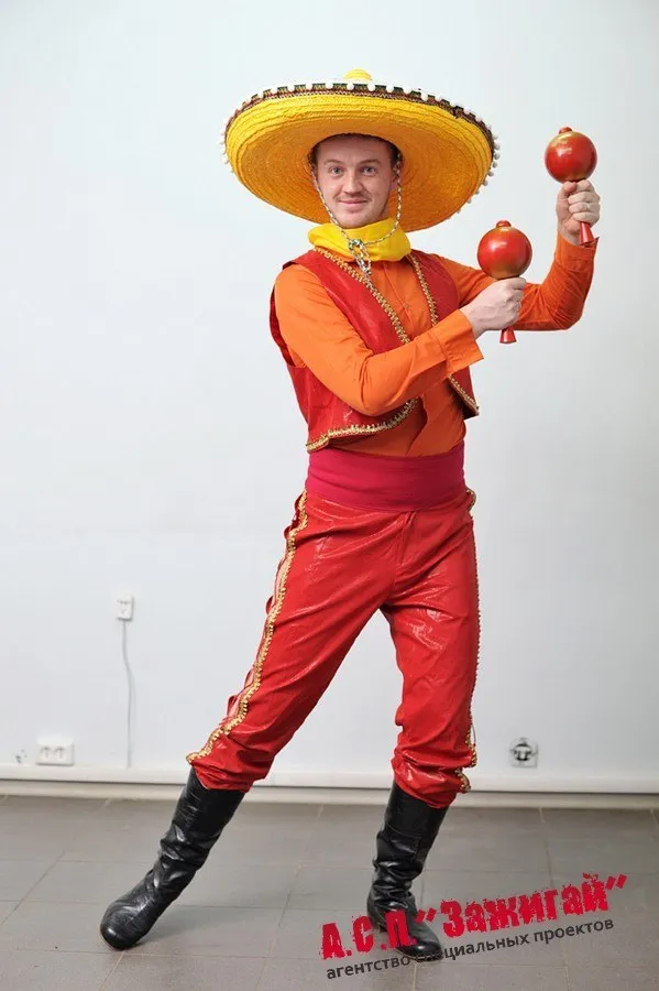 Описание: Комплект состоит из брюк. И жилетки, оранжевой рубашки в сочетании с желтым платком. Образ завершает сомбреро