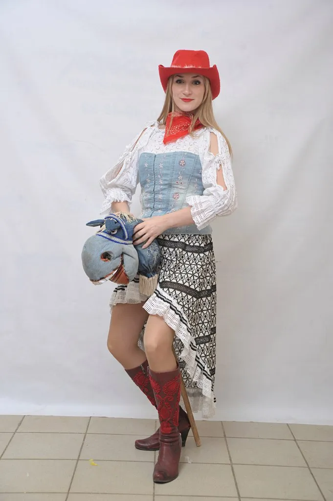 Описание: Джинсовый корсет, декорированный вышивкой в комплекте с хлопковой рубашкой и юбкой. Образ завершает яркая бандана, оригинальные сапоги и шляпа.