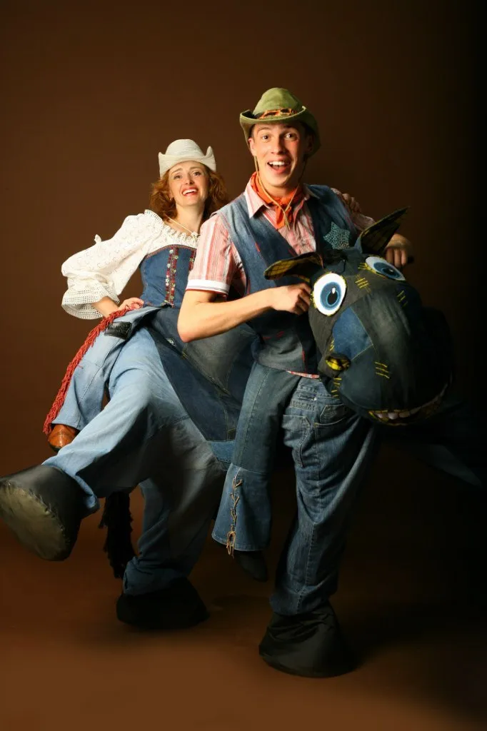 Описание: джинсовая бутафорская лошадь для двоих человек