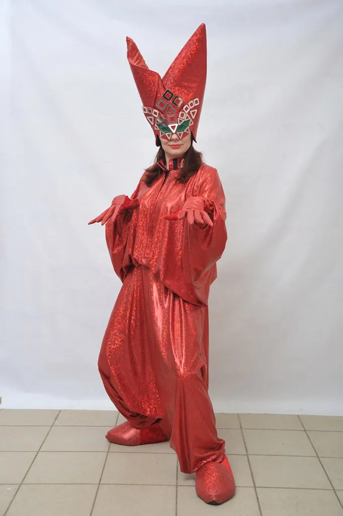 Описание: Красный переливающийся комбинезон на резинке по талии в сочетании с головным убором, перчатками и обувью