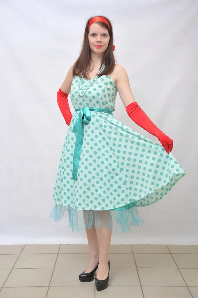 Описание: Хлопковое платье в горошек с подъюбником. Образ завершают яркие перчатки, бусы и атласная лента .