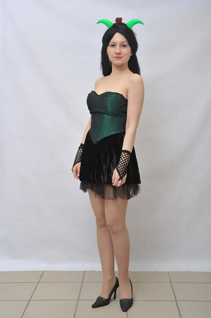 Описание: Двухцветное укороченное платье на молнии. Образ завершают перчатки и рожки.
