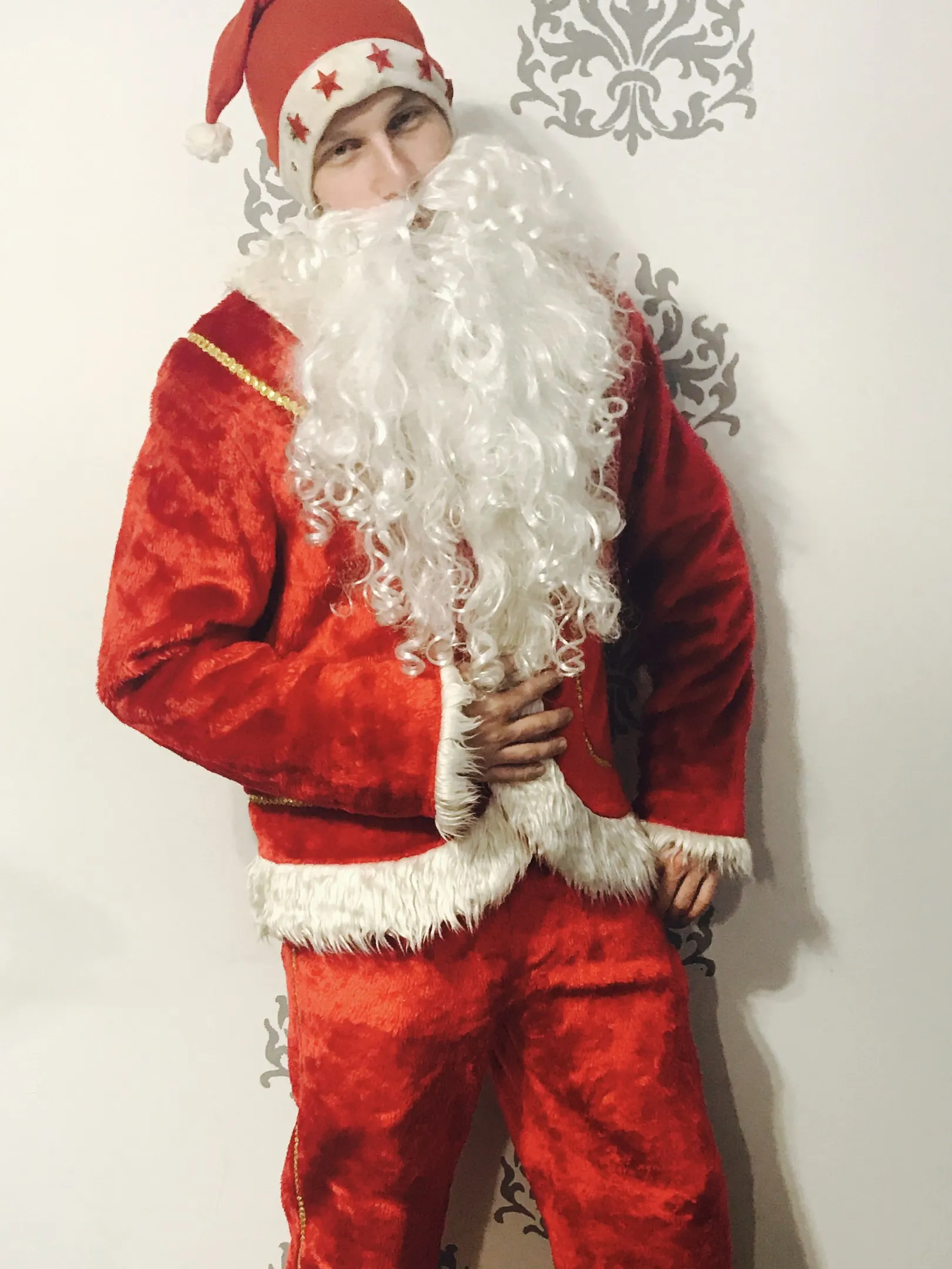 - 📏 Размер: 48-50. Описание: Трикотажный комплект состоит из куртки, отороченной мехом, брюк, пояса, шапки.(шапки могут быть разные), борода , парик.