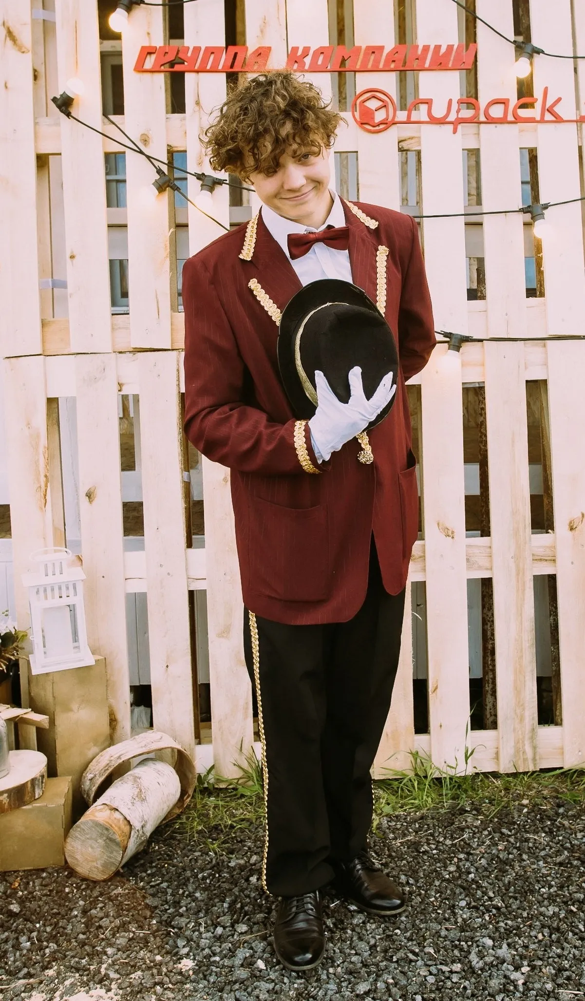 В комплект входят: пиджак, брюки, рубашка, шляпа, перчатки, бабочка