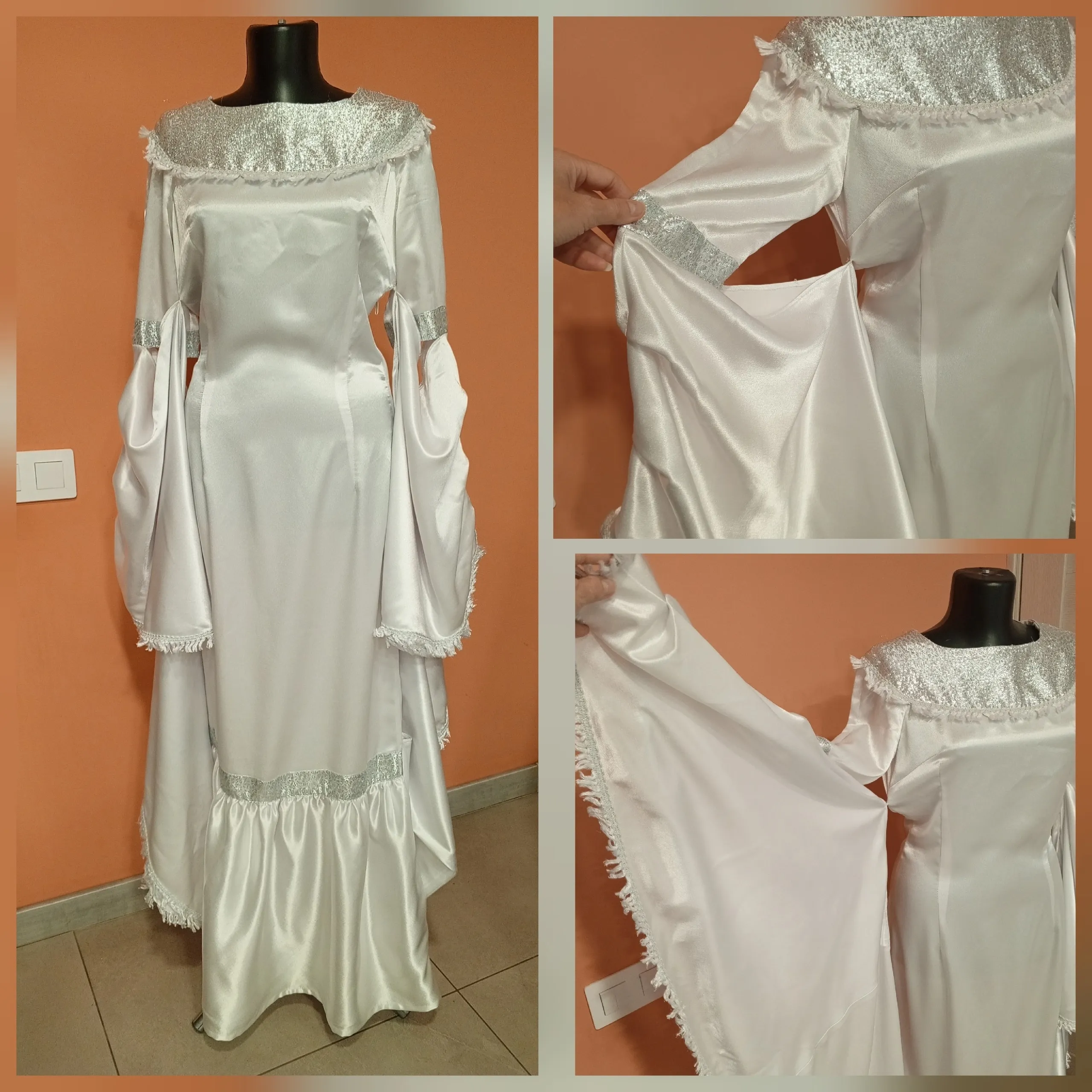 Описание: Комплект состоит из белого платья с расклешенным рукавом, накидки из серебристой ткани со стоячим воротником. Образ завершает головной убор в форме короны.