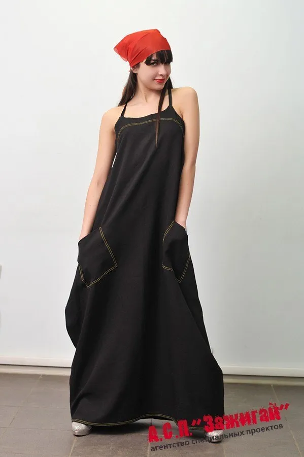 Описание: Черное платье на бретелях свободного кроя с декоративной контрастной строчкой . Образ завершает красная косынка