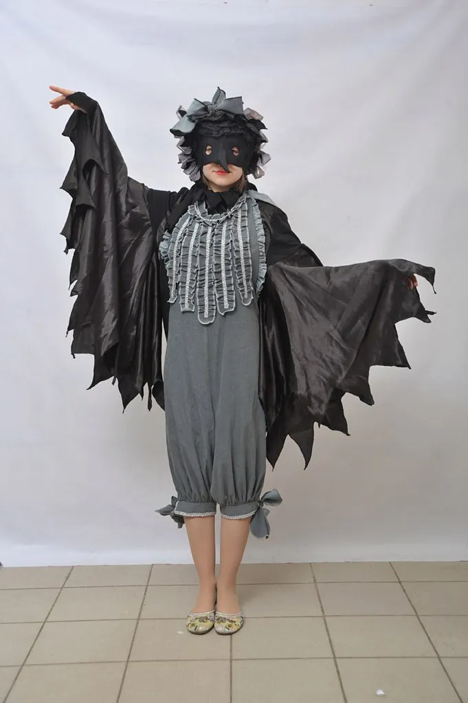 Описание: Трикотажный серый комбинезон в комплекте с рукавами, имитирующие крыло птицы. Образ завершает головной убор