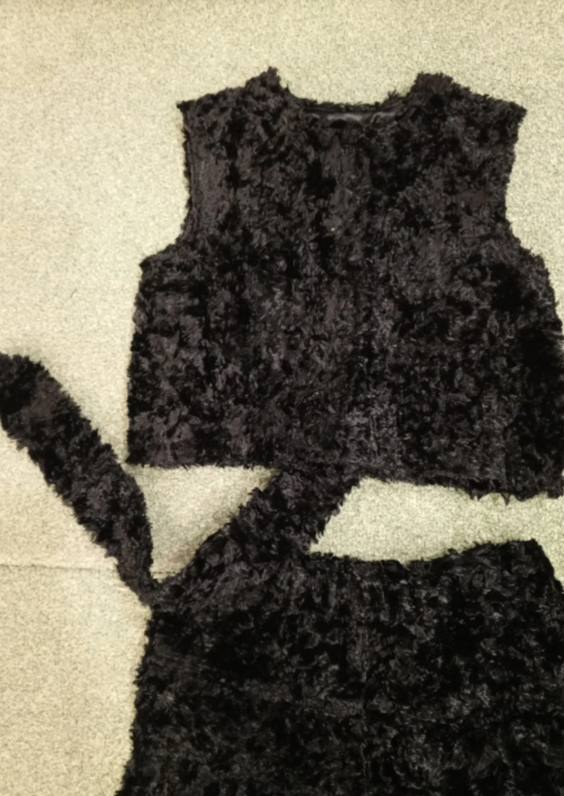 Костюм состоит из брюк, жилета с хвостом м шапочки с ушками