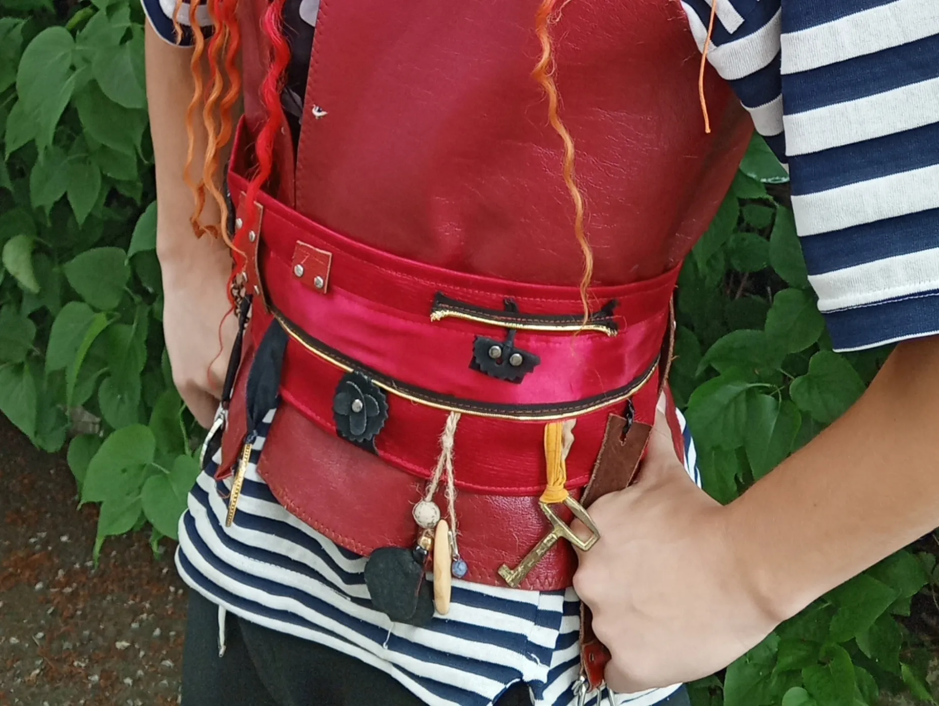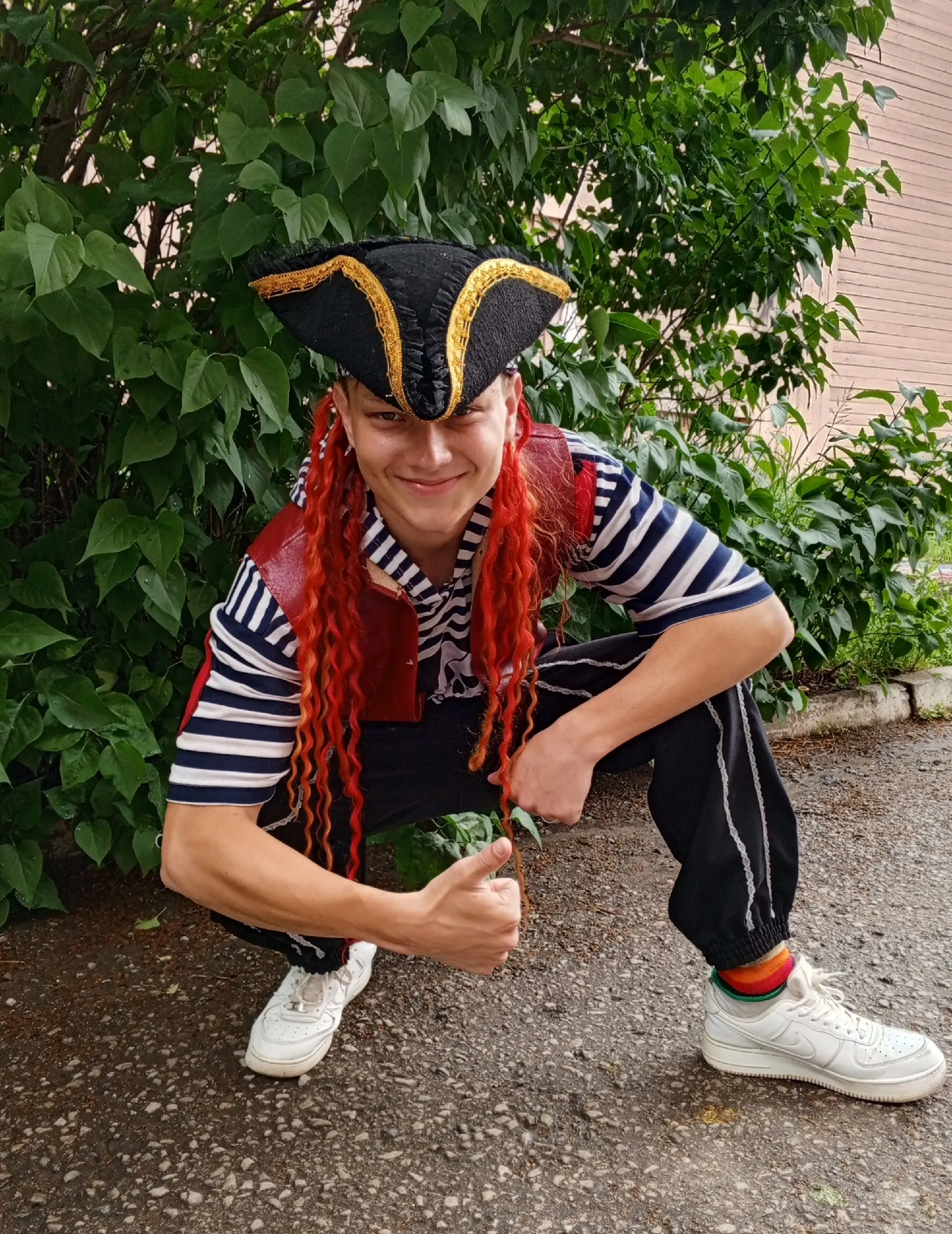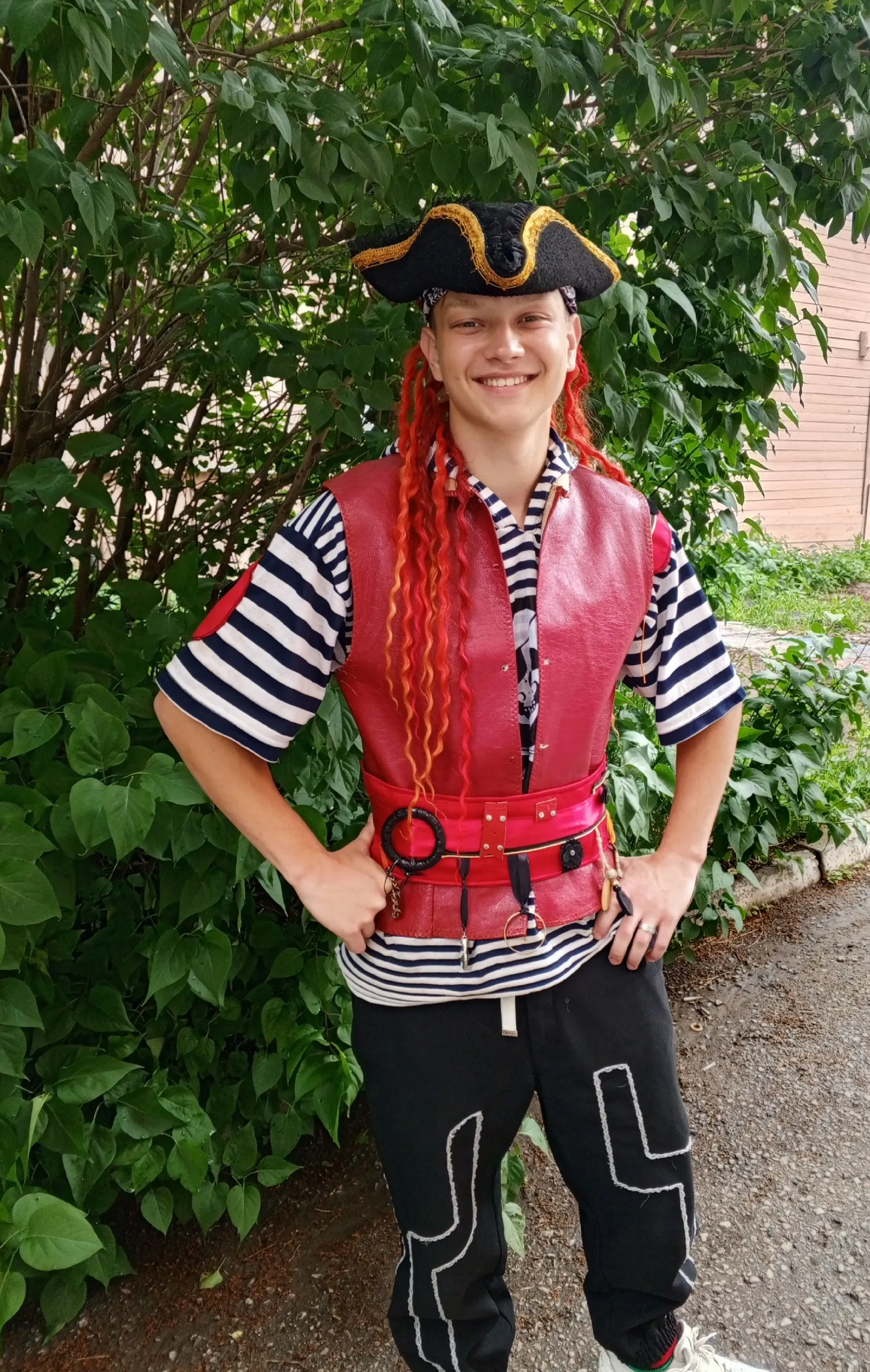 В комплект входит: тельняшка с капюшоном без рукавов, жилетка, пояс, треуголка, волосы и брюки