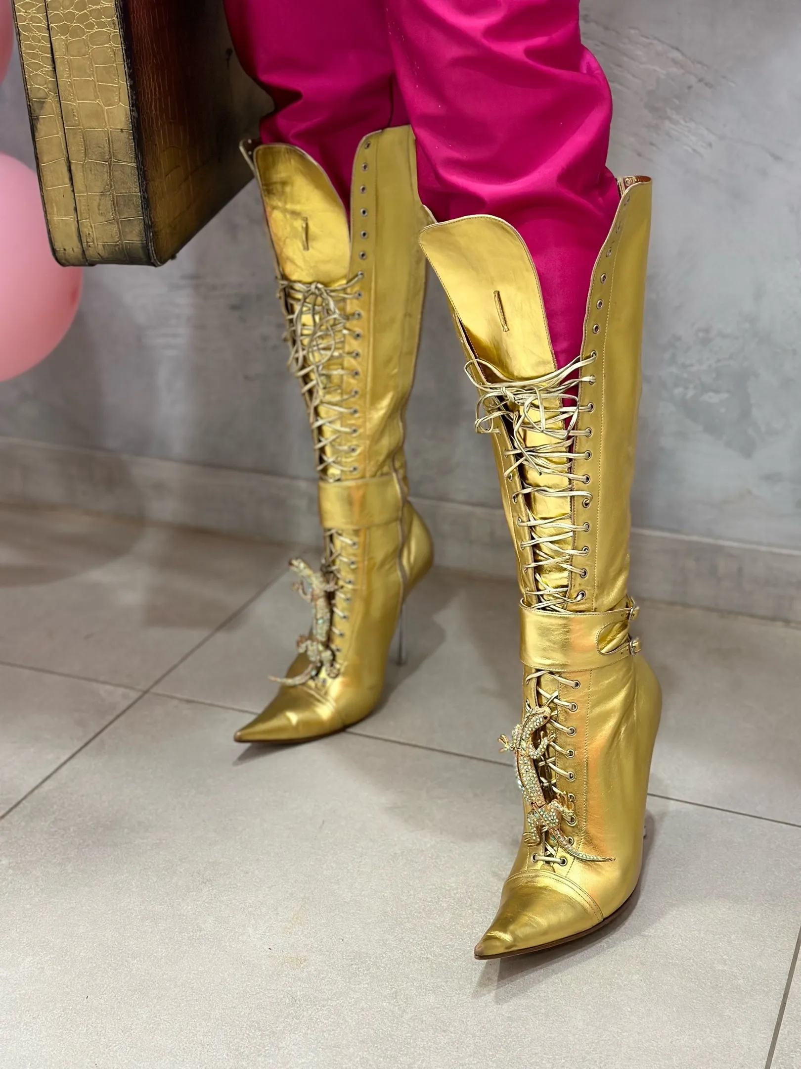 Яркий комбинезон, парик, очки, повязка на голову, сапоги.