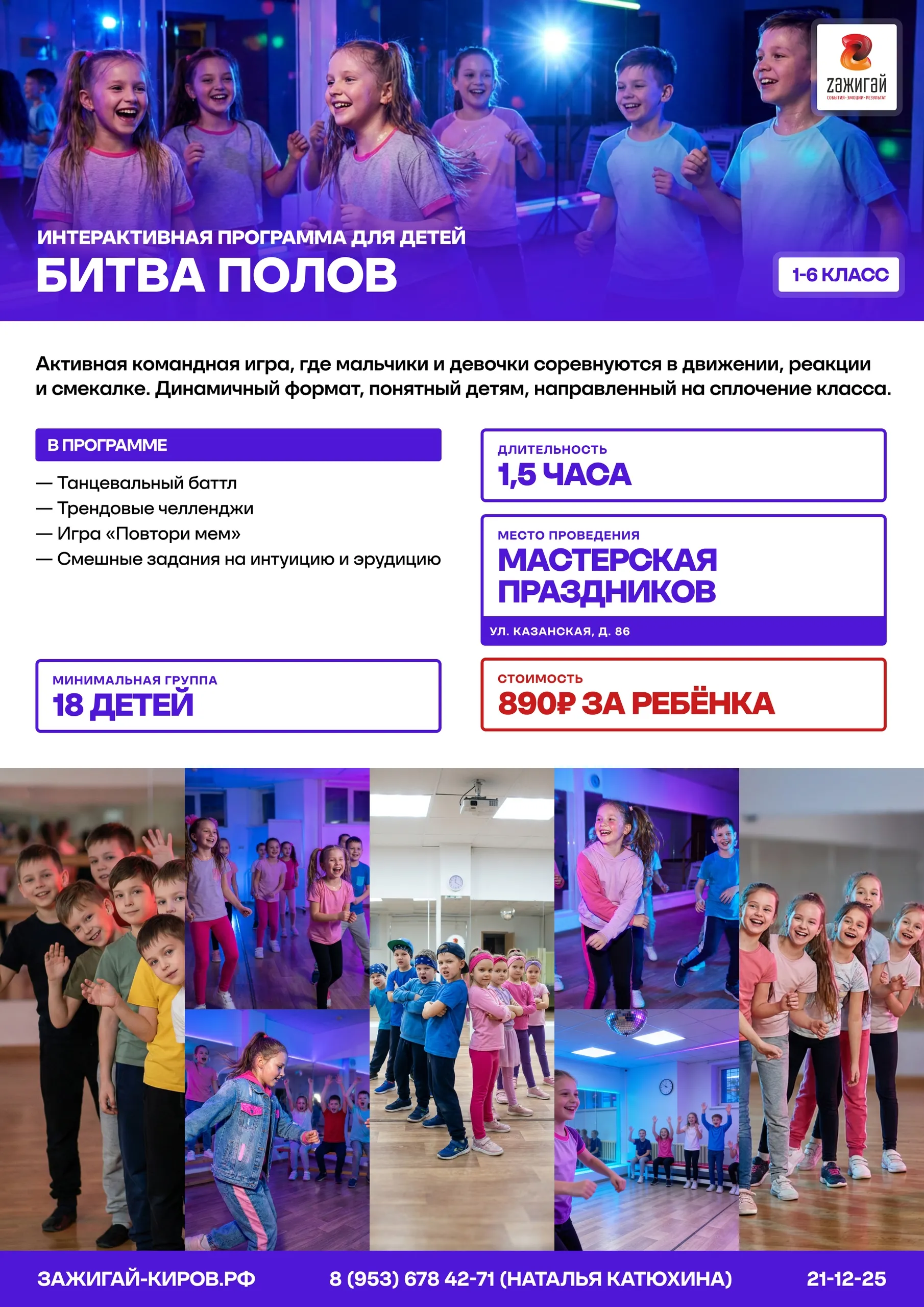 🎈 Хотите подарить ребёнку яркий и незабываемый праздник? «Интерактивная программа «Битва полов» — мероприятие для детей и школьников» от агентства «Зажигай» — это профессиональные аниматоры, весёлые конкурсы и море впечатлений для детей в Кирове!